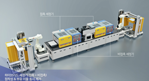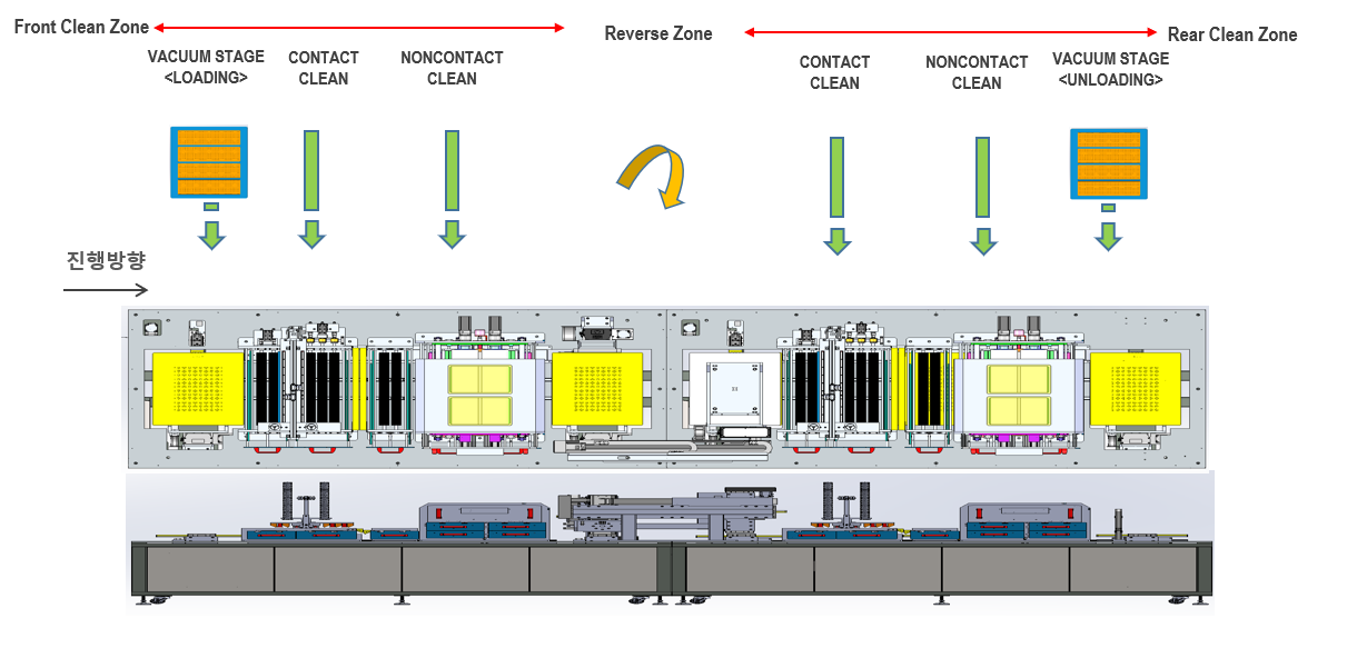 Hybrid Clean Machine은 제품을 진공 Stage에 부착 후 세정제를 제품 표면에 도포한 후 표면의 점착성(고착성 )이물을 Spon Brush을 회전시켜 1차 제거하는 Contact Clean 공정과, 정전기와 진공 흠입을 병행하여, 세정하는 Noncontact Clean 공정을 병행하여 진행하는 세정 장치입니다.